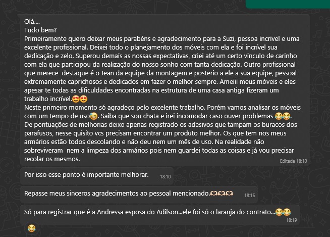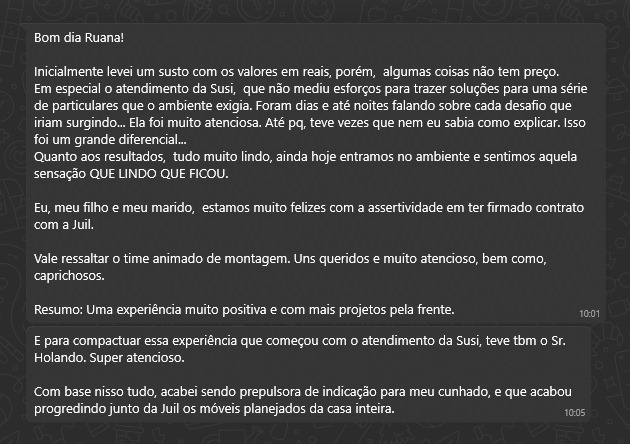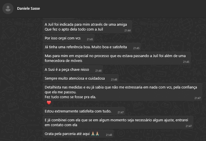 "Excelência na visita para medidas e projeto, prazo de entrega e instalação.Tudo impecável!!! Só com a Juil!!!"